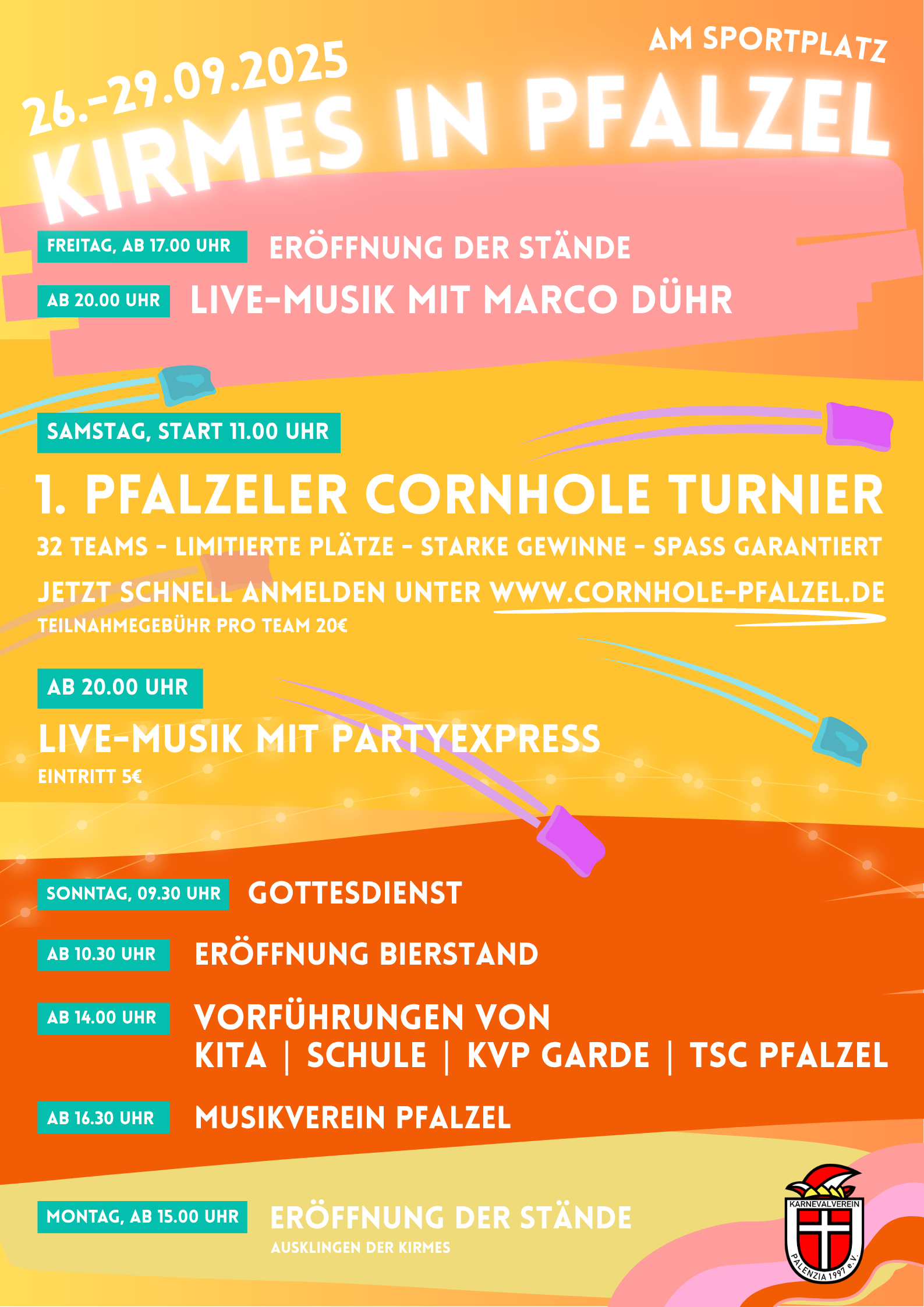 Das Turnier findet im Rahmen der Pfalzeler Kirmes statt. Mit deiner Teilnahme am Cornhole-Turnier erhältst Du automatisch ein Bändchen, welches dir kostenfreien Zugang zur Abendveranstaltung ermöglicht. Nach dem Turnier bist Du herzlich Willkommen auf der Pfalzeler Kirmes.